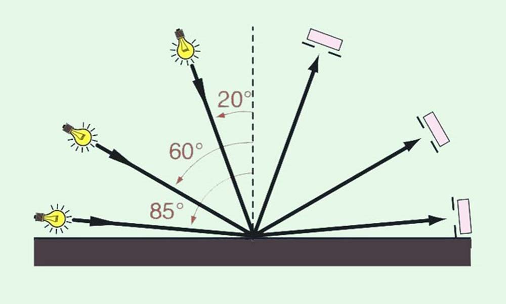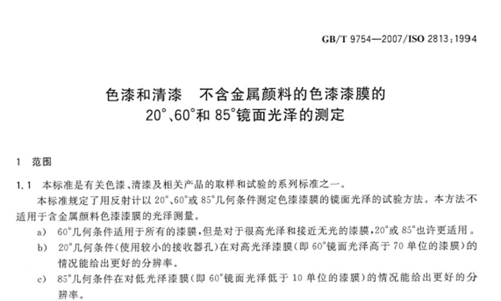 在國(guó)家標(biāo)準(zhǔn)GB/T9754-2007中,對(duì)于色漆、清漆、不含金屬顏料的色漆漆膜等的光澤度提出了明確的判定方法,以20°、60°或85°幾何條件來(lái)測(cè)定。20°、60°、85°三個(gè)測(cè)量角度是指與被測(cè)物表面垂直的法線與入射光束的夾角。60°適用于所有漆膜,20°更適合高光澤漆膜,即60°鏡面光澤度高于70單位的漆膜,85°適用于低光澤漆膜,即60°鏡面光澤低于10單位的漆膜。一般而言,可用60°的通用角度測(cè)量油漆。
